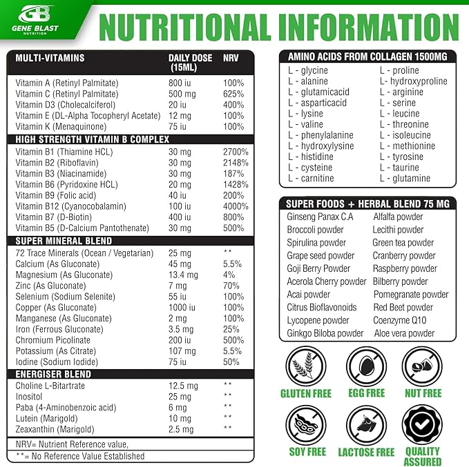 Please scroll through the product images to view the complete panels for Active Kids, Multi Shot, and Liquid Iron. If you have any questions, our team is happy to help.